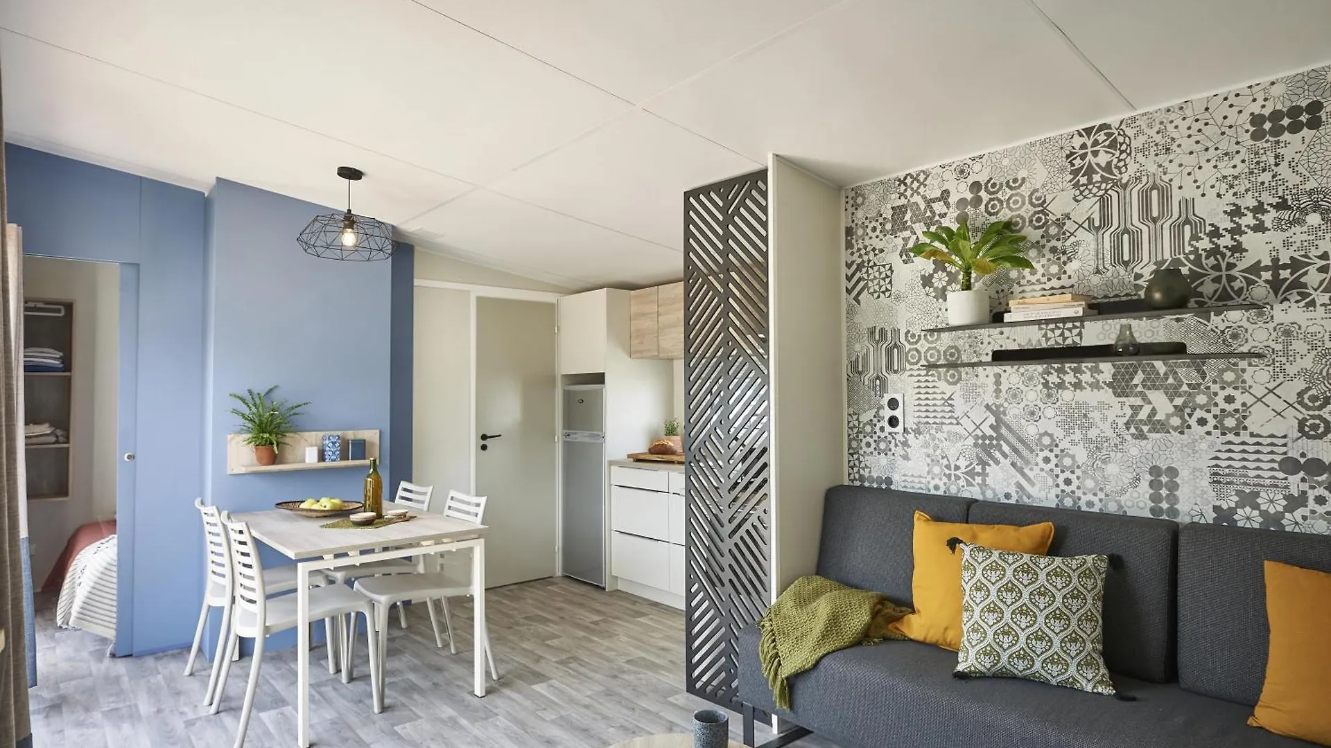Réfrigérateur et table de cuisson sont également fournis.